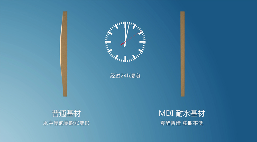 采用 新型MDI高密度耐水型環(huán)?;?,不僅制造原料零醛添加,生產(chǎn)過(guò)程零醛污染。還降低了基材因受潮泡水而出現(xiàn)的鼓包起拱現(xiàn)象,穩(wěn)定性得到大幅提升。